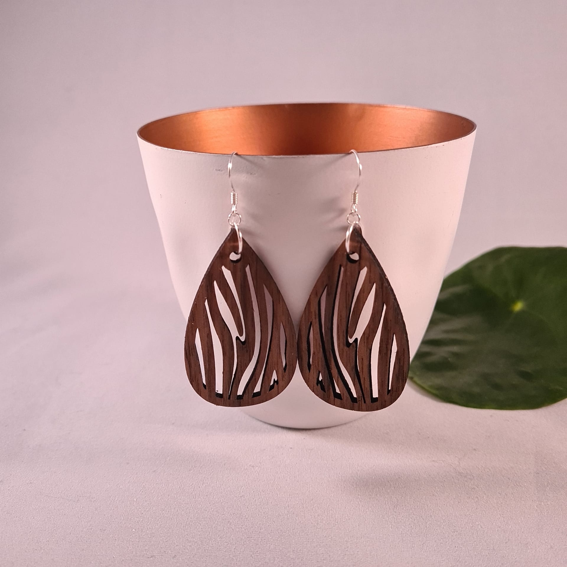 Deze houten oorbellen in druppelvorm met een speels zebrapatroon combineren natuurlijke warmte met een vleugje expressiviteit. Het contrast van het gegraveerde motief en de zachte houttinten zorgt voor een uniek, stijlvol effect.