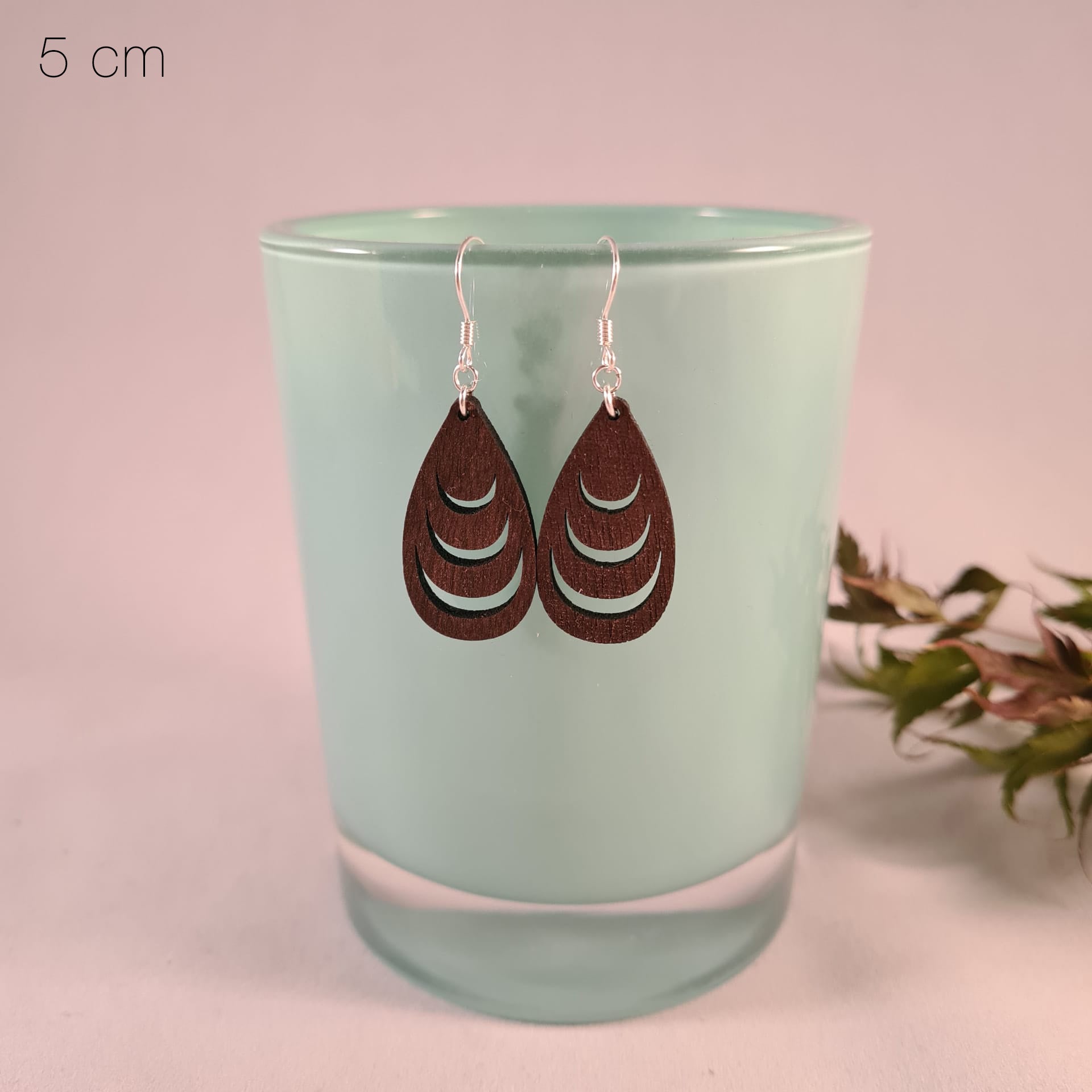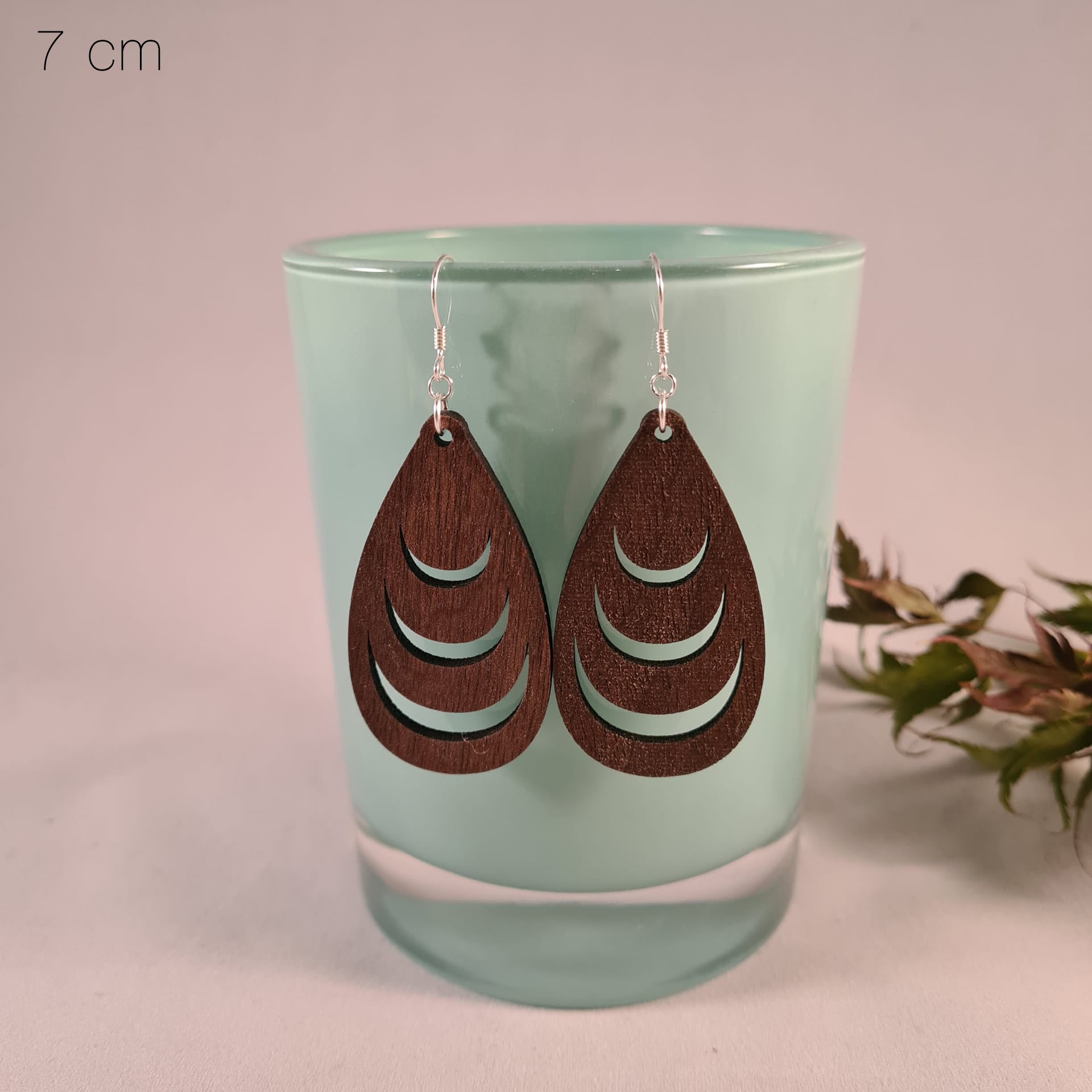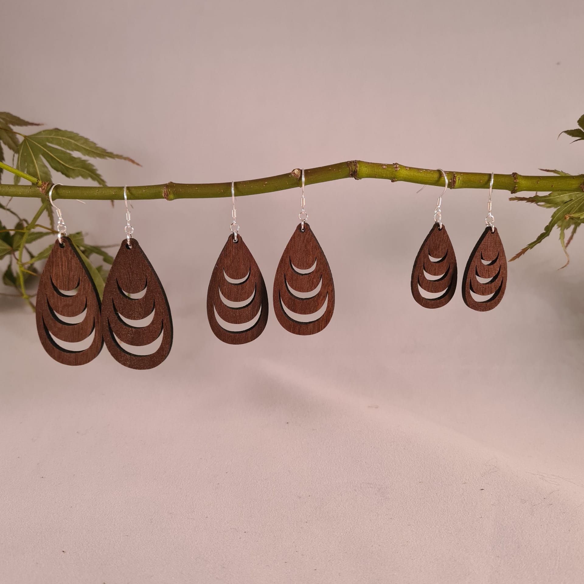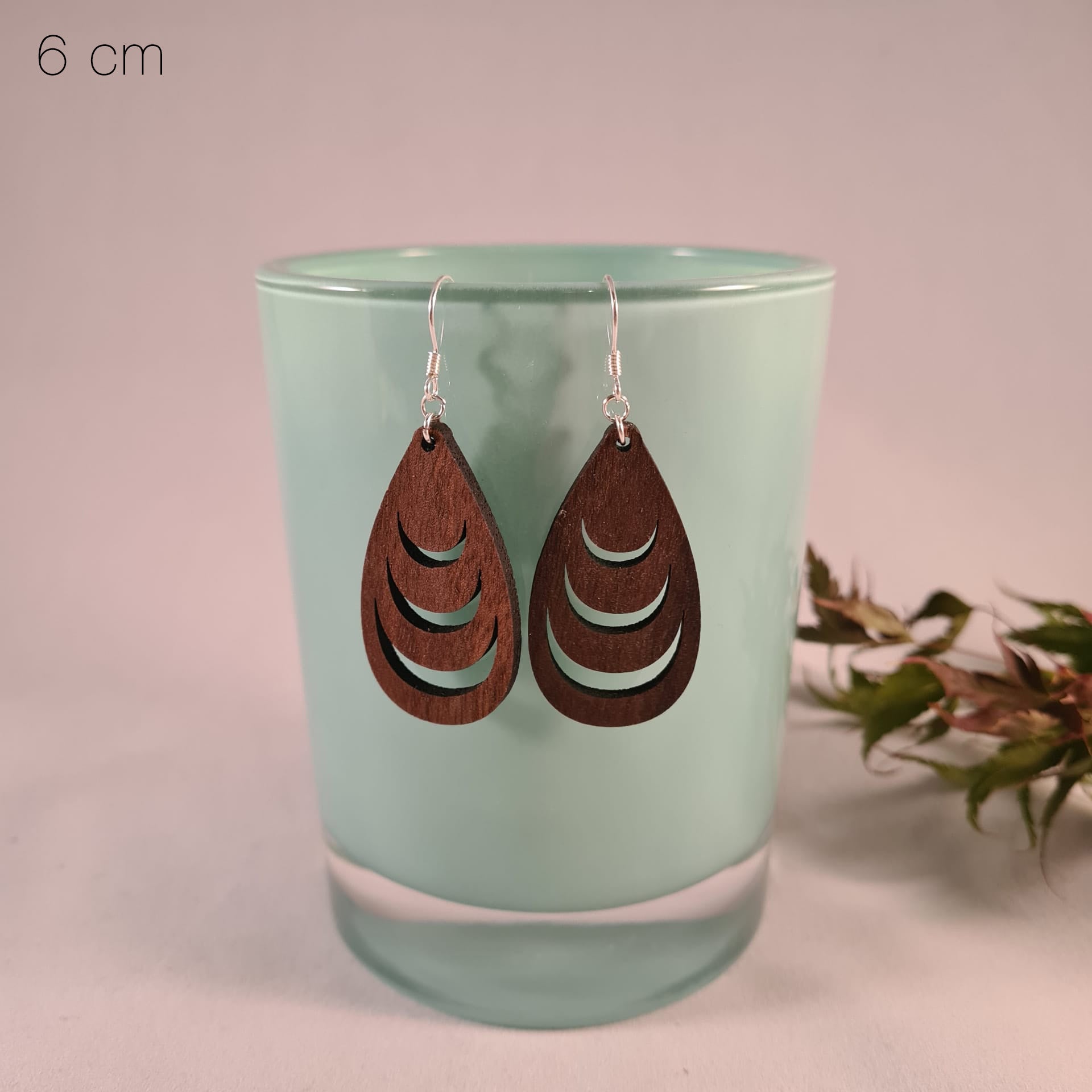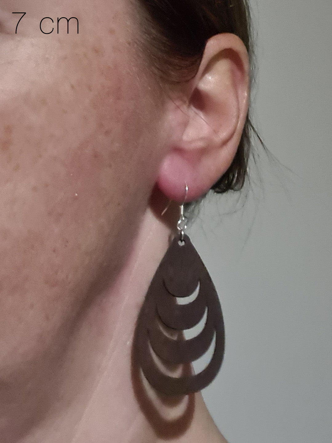 Deze houten oorbellen in druppelvorm met uitgesneden laagjes brengen diepte en karakter in een verfijnd ontwerp. De zachte rondingen en gelaagde structuur vangen het licht op een speelse manier, terwijl de natuurlijke houtkleur voor warmte zorgt.