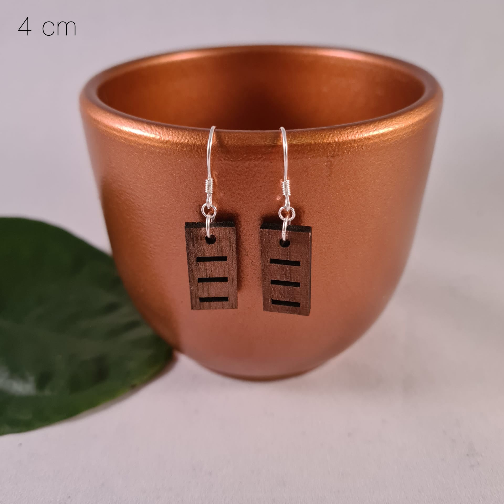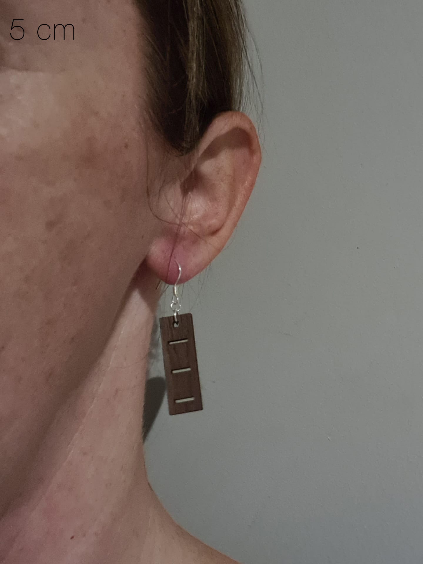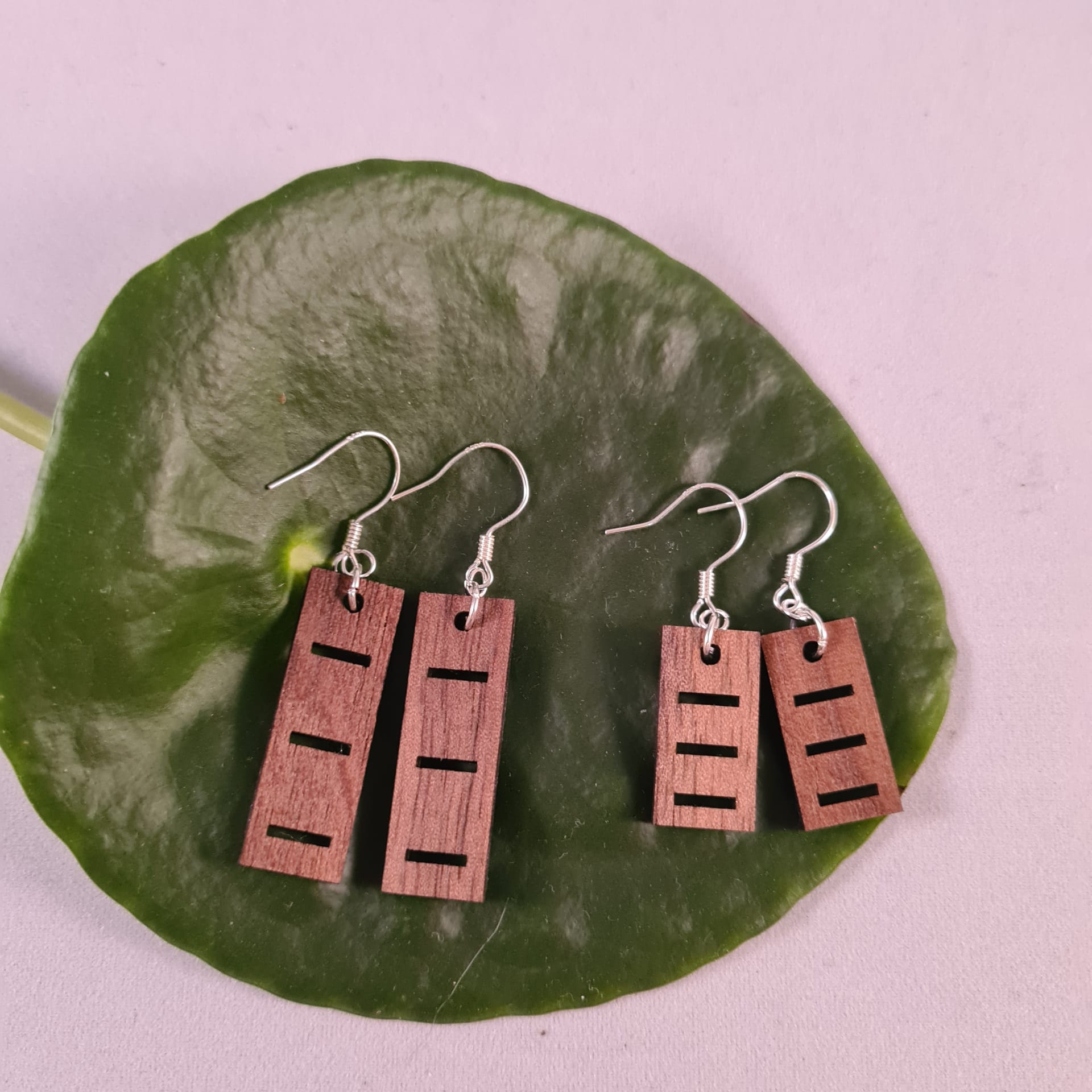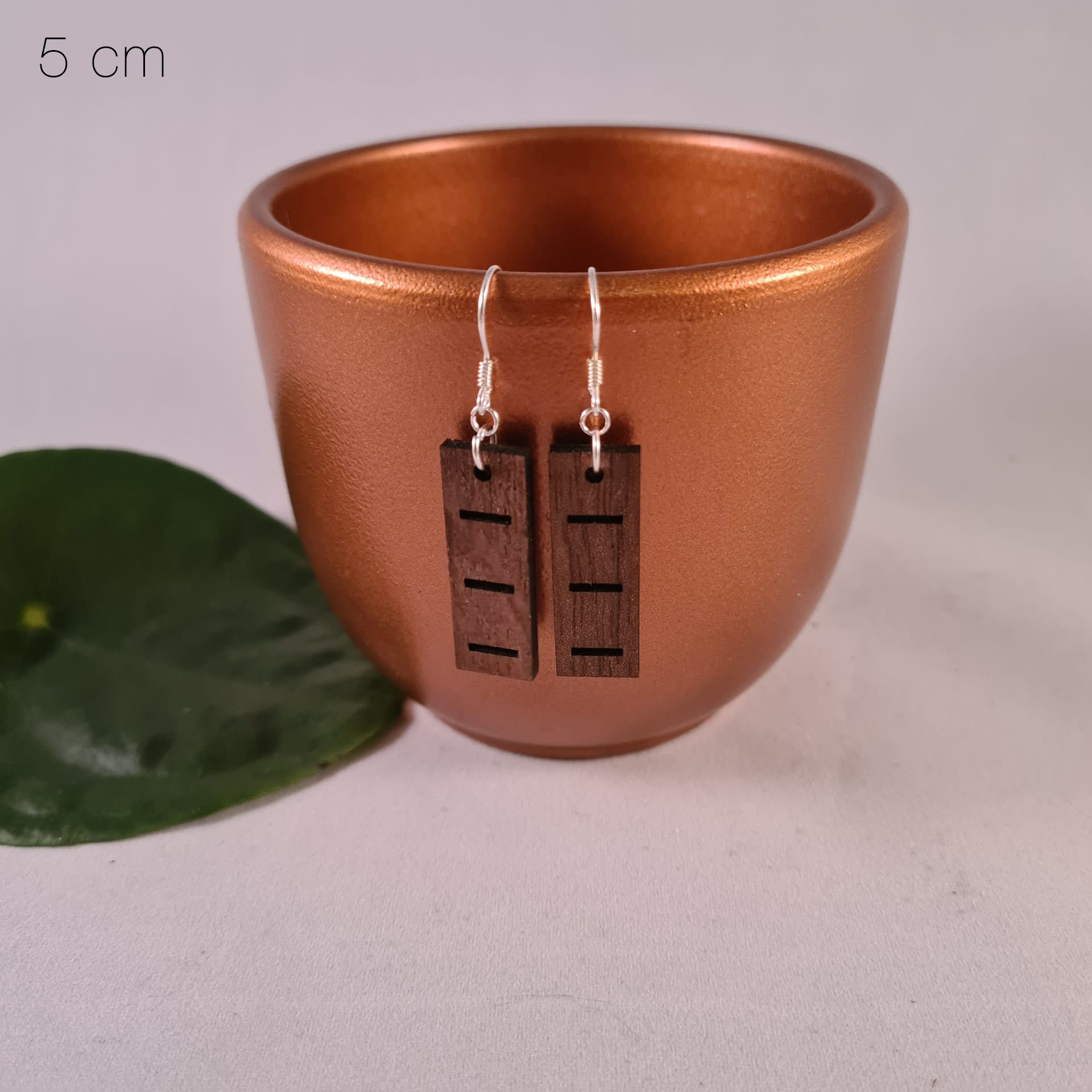 Deze houten oorbellen in staafvorm met fijne horizontale streepjes combineren modern design met natuurlijke warmte. Hun strakke lijnen en subtiel patroon geven een eigentijdse, minimalistische uitstraling die toch zacht aanvoelt.