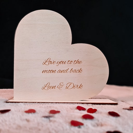 Een houten hart vol gevoel — met jouw eigen woorden gegraveerd. Een persoonlijk en warm gebaar dat recht uit het hart komt.
