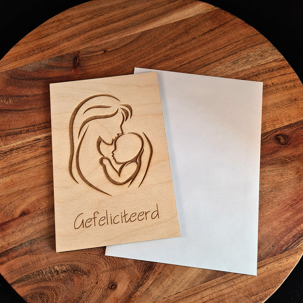 Originele houten wenskaart voor moederdag, of om een baby'tje te verwelkomen.