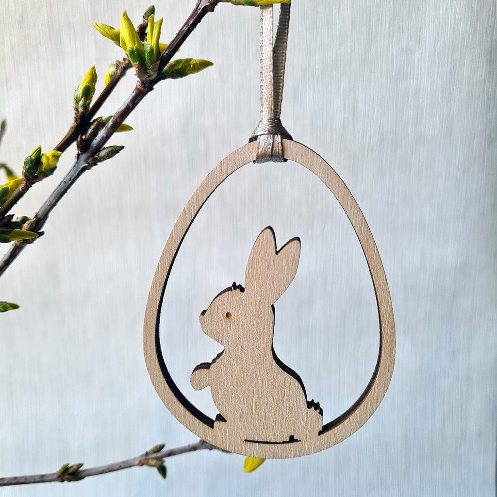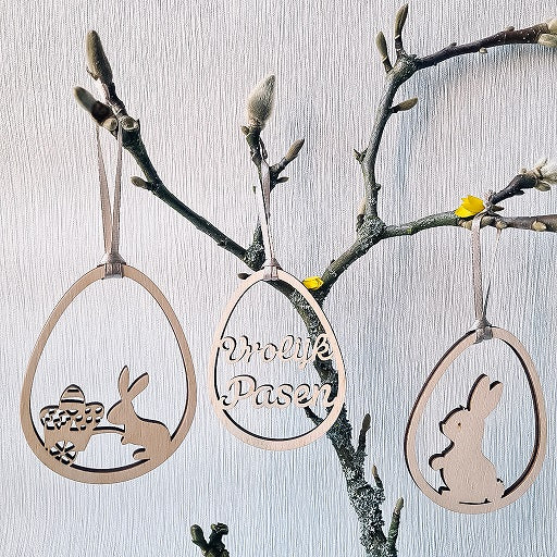 Fijne houten paashangers in open vorm, elk met een zacht en speels ontwerp. Ze brengen een vleugje lente en warmte aan elke paastak of tafel.