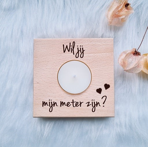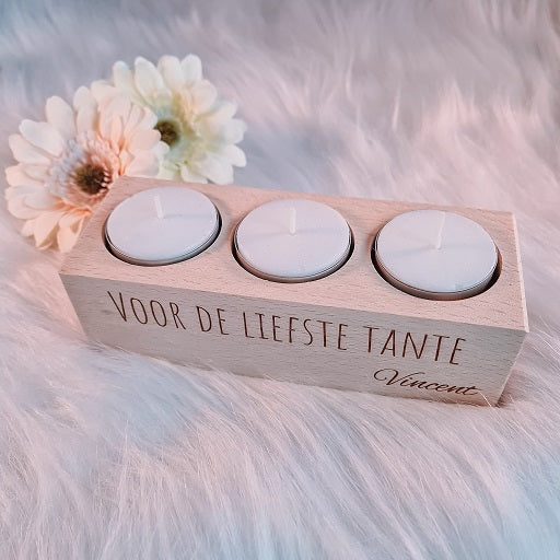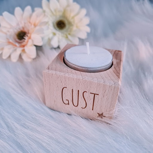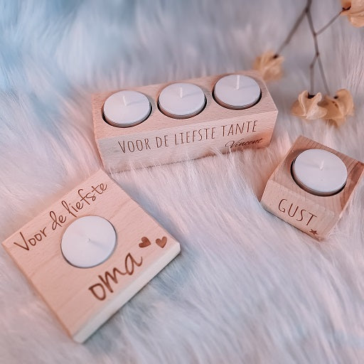 Een mooie gepersonaliseerde theelichthouder voor één kaarsje met je zelfgekozen tekst en figuurtjes. Ideaal als cadeautje!