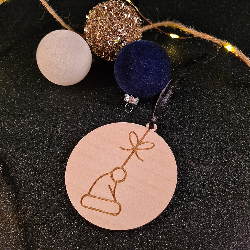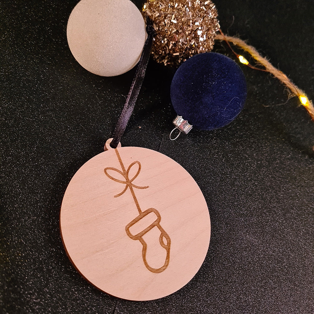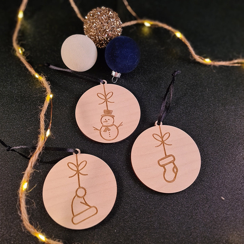 Drie lieve houten schijfjes met een vleugje wintermagie — een muts, een want en een sneeuwman brengen warmte en gezelligheid in je kerstboom.