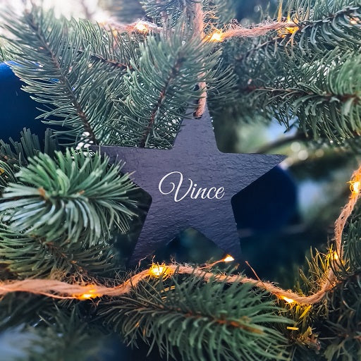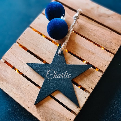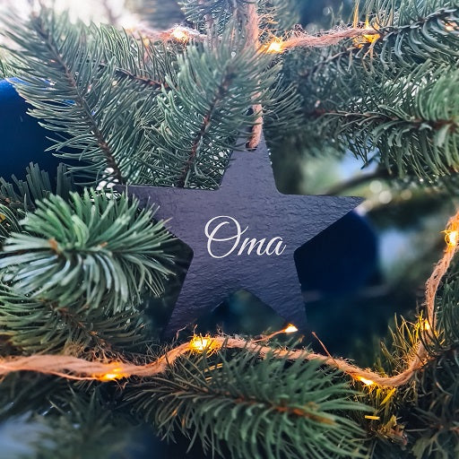 Unieke kerstversiering in leisteen met zelfgekozen naam, per stuk verkrijgbaar.