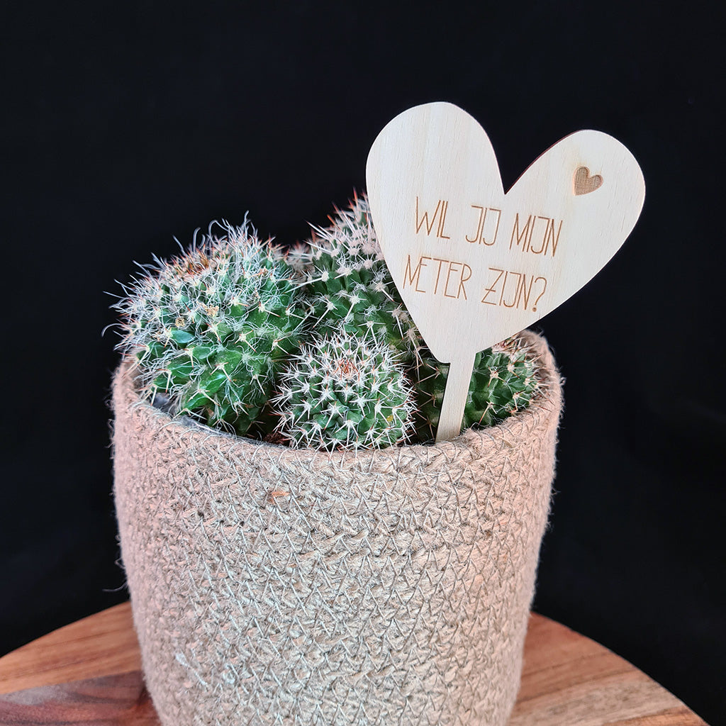 Een klein houten hartje dat grootse liefde uitdrukt — een tedere plantenprikker om meter of peter op een warme manier te bedanken.